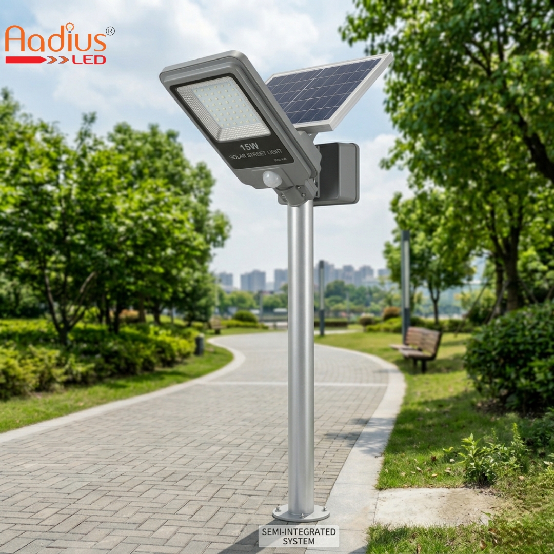 15W solar street light is a popular choice for illuminating pathways, residential gardens, and colony roads. These systems are typically available in two main configurations: All-in-One (AIO), where the panel, battery, and LED are integrated into a single housing, and Two-in-One, where the solar panel is a separate unit for better sun orientation.